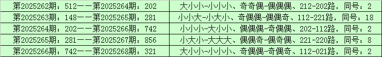 统计排列三已开出的奖号发现,在连续5期(第2025262期-第2025266)奖号为:512-148-202-281-742。