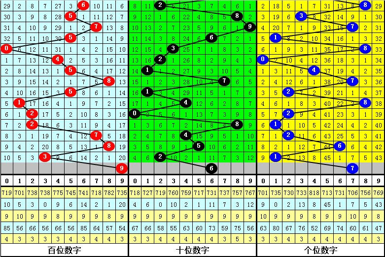 百位分析:百位最近9期出号:5-8-5-1-2-2-7-8-3,奖号大小比为5:4,奇偶比为5:4,012路比为1:2:6,本期百位参考号码459。