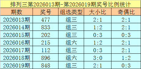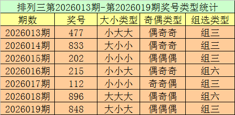 排列三第2026019期回顾:奖号848,奇偶比0:3,大小比2:1,和值20,类型:组三。