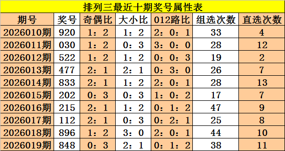 上期回顾:体彩排列三第2026019期奖号:848,奇偶比0:3,大小比2:1,012比0:1:2。