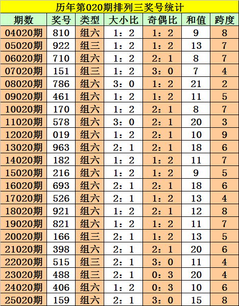 历年第020期排列三奖号中,开出次数最多三码为:0、1、6,本期注意号码:6。