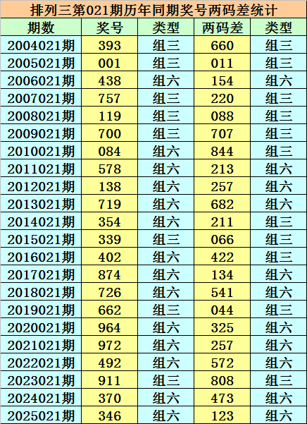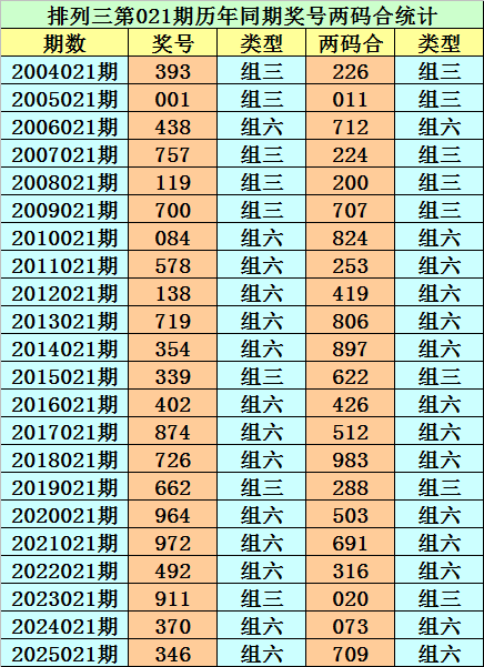 排列三从2004年开奖至今已开出7495期奖号了,其中第021期历史同期奖号出现22次,历年第021期分别开出号码:393、001、438、757、119、700、084、578、138、719、354、339、402、874、726、662、964、972、492、911、370、346。