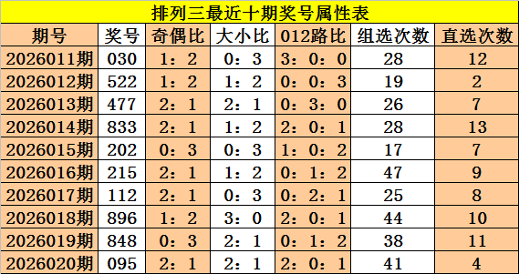 上期回顾:体彩排列三第2026020期奖号:095,奇偶比2:1,大小比2:1,012比2:0:1。