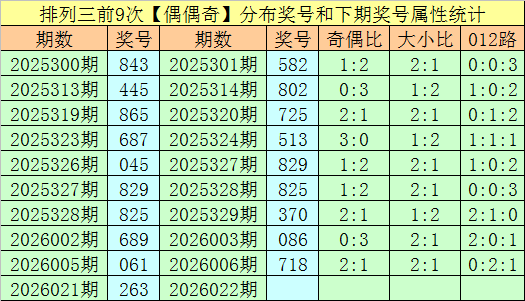 上期回顾:排列三第2026021期开出奖号263,类型为:偶偶奇、200路和小大小。