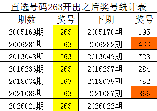 从上表统计可以看出,直选号码263开出之后,其下期奖号: