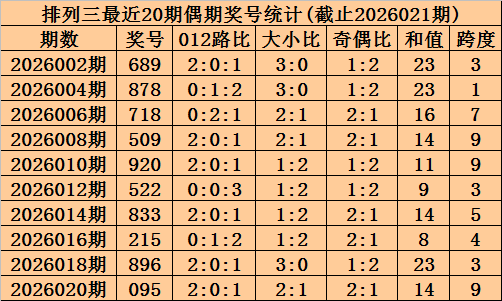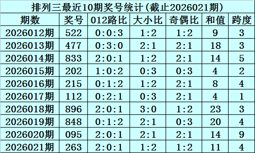 上期回顾:排列三2026021期奖号为263,奇偶比为1:2,大小比为1:2,跨度为11。
