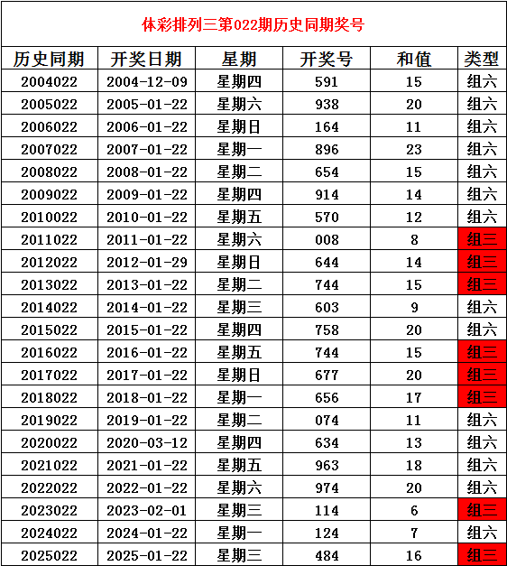 2026年1月22日排列三第022期开奖,历史同期分别开出奖号: