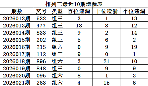 上期回顾:排列三第2026021期奖号:263,组六,直选遗漏总值为25期。
