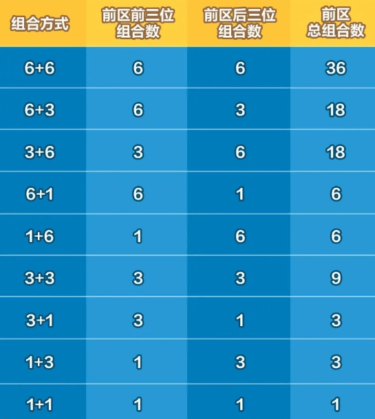简单说就是把7星彩前区分成前三位和后三位(这里的3代表的是数字个数),分别进行组合选号,即前三位选择三个号码,后三位选择三个号码,如前三位选择3个不同数字,后三位选择3个不同数字,共6x6=36种号码组合。