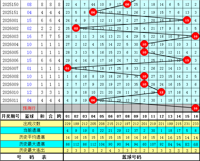蓝球分析:最近9周星期二蓝球分别开出号码:12、06、16、14、16、04、16、15、10,本周星期二看好出现大号蓝球,参考蓝球号码16。