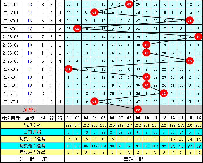 双色球第26011期蓝球开出余数1路、偶数、小 号04,余数1路蓝球间隔1期再次出现。