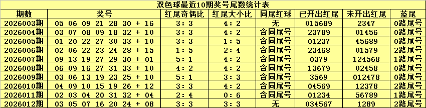 双色球第2026012期奖号为:03 05 07 16 20 24 + 08,红球尾数为:034567,没有出现同尾红球。