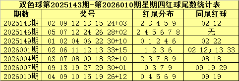 第一二位红尾分析:最近7周星期四红球第一二位尾数分别开出:29、57、12、26、37、93、49,同尾号开出较多;在最近7周星期四尾数分布中,尾数0、8轮空,尾数3、5、6、7、8、9出现1个,1出现2个,2出现4个,上周星期四开出尾数组合4-9为全奇组合,本周星期四注意尾数奇偶平衡,看好尾数组合1-2。