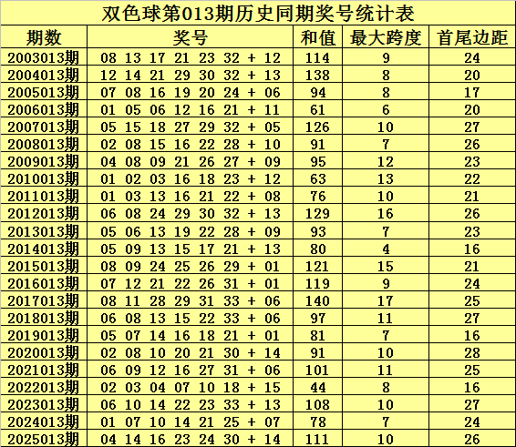 最大跨度推荐:在第013期历史同期开奖中,红球最大跨度全部在4-17之间开出,今年同期适当关注10附近的最大跨度开出。