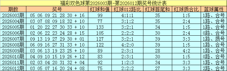 福彩双色球第2026012期红球奖号为:03、05、07、16、20、24,蓝球奖号为:08,其中红球和值为75,012路比为2:2:2,首尾和为27,质合比为3:3,蓝球属性为2路、合号。