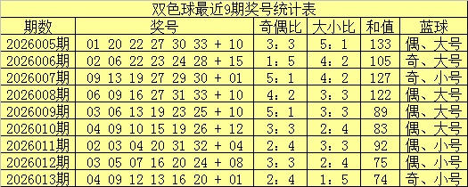 奇偶比:上期红球奇偶比为2:4,其中偶号红球表现活跃,最近9期红球奇偶比为28:26,奇偶红球走势相当,本期预计奇偶红球继续平衡出现,关注奇偶比3:3。