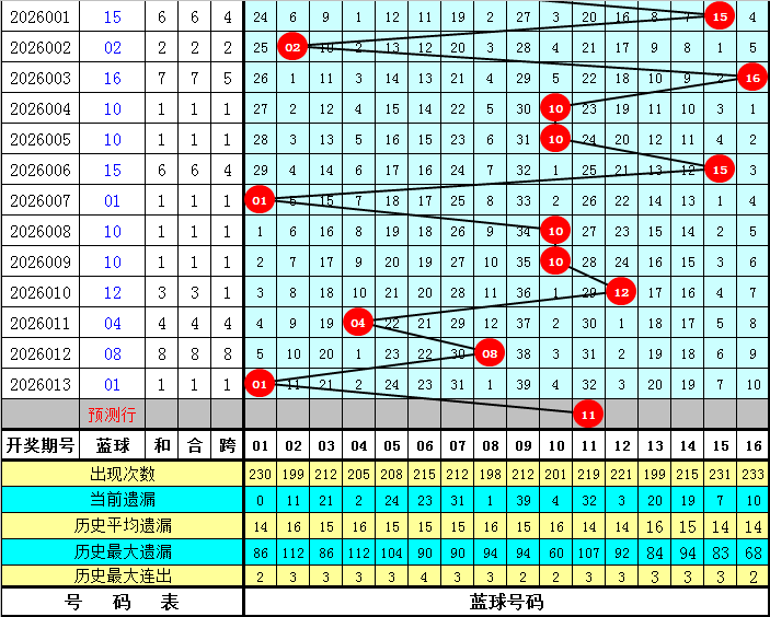 开奖回顾:双色球第2026013期开出奖号为:04 09 12 13 16 20 + 01,其中红球奇偶比为2:4,遗漏期数分别为1期、2期、11期、3期、0期、0期,遗漏总值为17期,蓝球遗漏期数为5期。