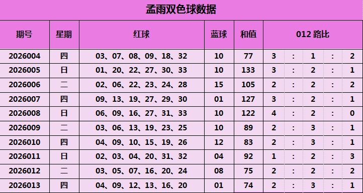 双色球上期开出奖号:红球04、09、12、13、16、20,蓝球01,012路比2:3:1,和值74。