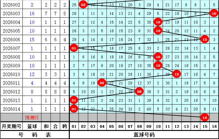 蓝球分析:第2026014期开出蓝球01,最近10期蓝球号码遗漏期数分别为:0期、4期、29期、2期、0期、24期、10期、12期、5期、0期,第2026015期蓝球注意05-15段出号,重点关注0路蓝球,参考蓝球:15。