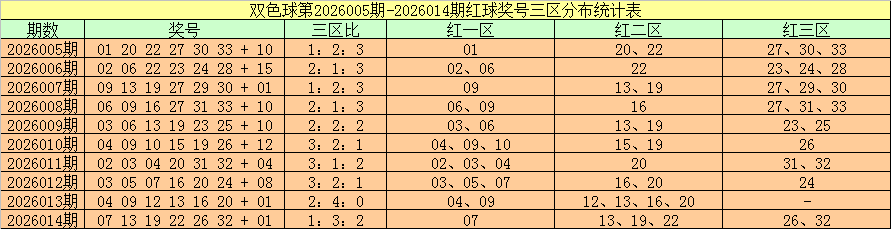 双色球第2026014期奖号为:07 13 19 22 26 32 + 01,红球三区比为1:3:2。