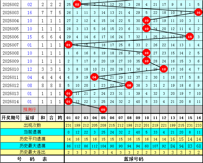 上期开出蓝球号码01,蓝球为重号。目前蓝球遗漏值15以上的冷码有8个:03、05、06、07、09、11、13、14;遗漏值在7-15之间的温码蓝球有3个:02、15、16;遗漏值6以内的热码蓝球有5个:01、04、08、10、12。本期防止冷码蓝球解冻,参考蓝球号码:01、05、06、13、15。