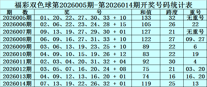 双色球第2026014期奖号开出:07、13、19、22、26、32 + 01,红球号码和值开出119,跨度开出25,开出重号1个:13。蓝球为1路号码。