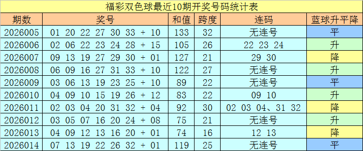 上期开奖:福彩双色球第2026014奖号开出:07 13 19 22 26 32 + 01,红球号码和值为119,首尾间距为25,无连号。