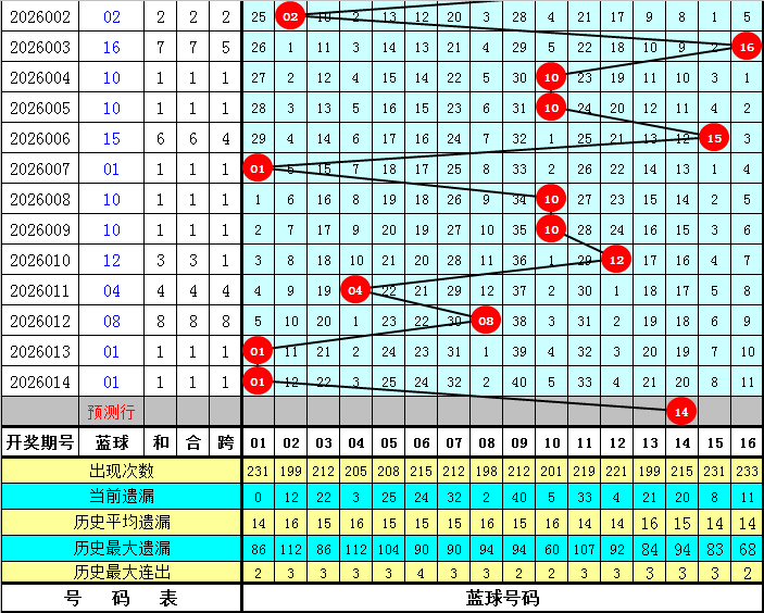 蓝球号码分析:上期蓝球为01,开出1路号码,蓝球最近10期012路比为2:7:1,最近30期012路比为8:14:8,最近100期012路比为28:40:32,本期蓝球看好2路号码,四码蓝球参考02、08、11、14。