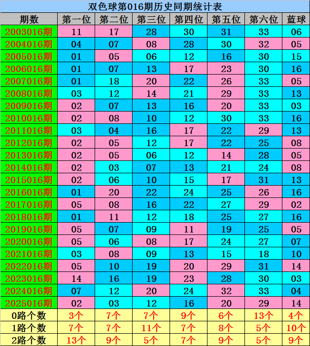 第一位:历史同期0路红球开出:03;1路红球开出;01、04、07;2路红球开出;02、05、11、14,红球012路个数比为3:7:13,去年同期开出2路奖号之后,今年同期防2路红球再出,参考红球05。