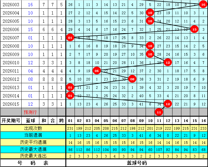蓝球:历史同期0路号开出:03、06、15;1路号开出;04、07、10、13、16;2路号开出;02、05、08、14,蓝球012路个数比为4:10:9,去年同期开出2路蓝球之后,今年同期防2路号再出,参考蓝球11。