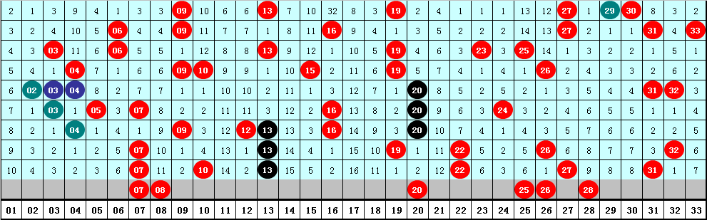 2、凤尾分析:最近十期凤尾号码分布在20-33区间,出现范围较广,凤尾012路为3:3:4,出现比例基本持平,本期预计凤尾为1路号码,参考28。