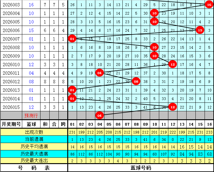 结合近期蓝球走势图来看,蓝球出现1路号的可能较大,重点考虑余数1、2路号,第26016期蓝球四码关注04、05、07、10,一码蓝球参考04。