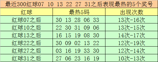 红球冷码统计:双色球第2026015期开出红球奖号分别为:07、10、13、22、27、31,在最近300期开奖中,各号码出现之后其下期出现最少的5个红球分别为: