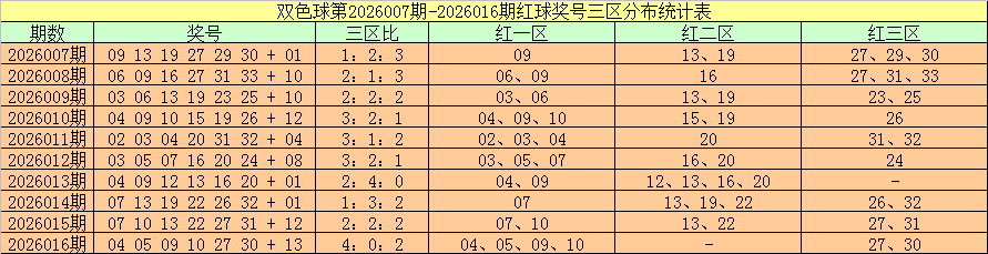 双色球第2026016期奖号为:04 05 09 10 27 30 + 13,红球三区比为4:0:2。