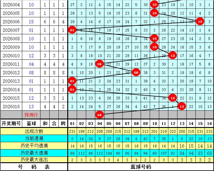蓝球走势分析:上周日第26014期蓝球开出号码01,最近十周星期日蓝球号码大小比为4:6,奇偶比为3:7,012路比为2:5:3。本期蓝球重点关注偶数号,看好蓝球02、04。