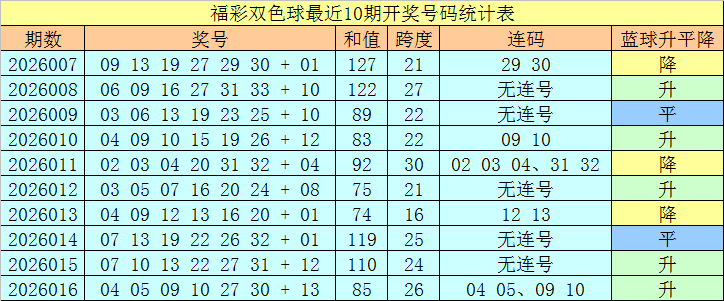 蓝球分析:上期蓝球开出号码13,上升1个点位,最近10期蓝球号码升平降分别为:降、升、平、升、降、升、降、平、升、升,本期看好蓝球下降,独蓝参考05。