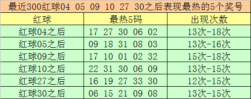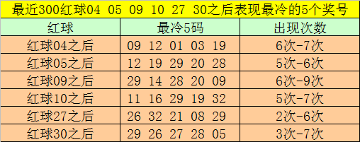 红球冷码统计:双色球第2026016期开出红球奖号分别为:04、05、09、10、27、30,在最近300期开奖中,各号码出现之后其下期出现最少的5个红球分别为: