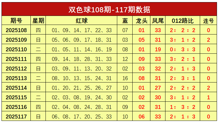 双色球第2025117开奖奖号:红球06、08、17、20、25、33,蓝球10。龙头06,凤尾33,012路比为2:1:3,未开出连号。