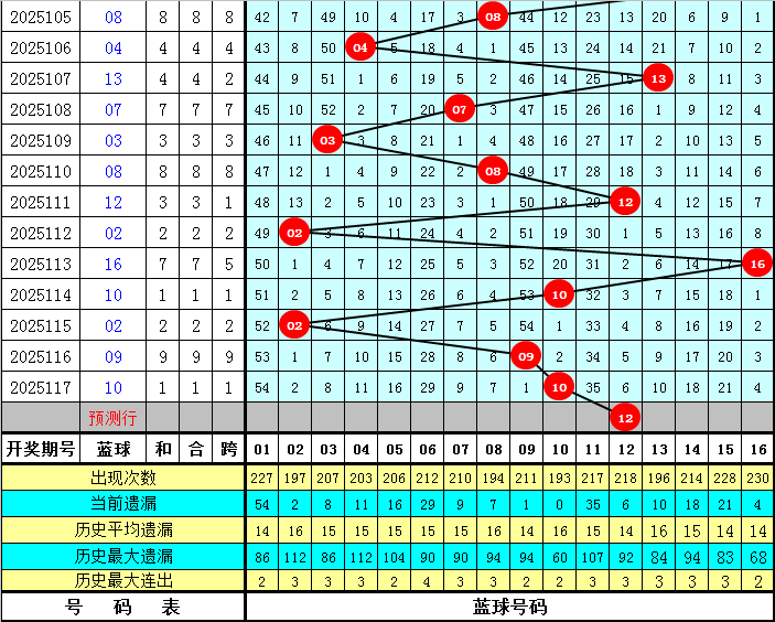 蓝球分析:蓝球大号近期表现活跃,本期重防大号蓝球热出,关注蓝球09、12、15、16。