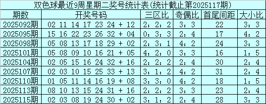 奇偶比分析:最近9周星期二奇偶红球出现个数比为27:27,红球奇偶落号相等,本期注意奇偶红球平衡出现,奇偶比看好3:3。