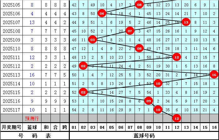 蓝球分析:上期蓝球落在第三区号码10,最近50期四区蓝球落号个数比为6:18:9:17,一区蓝球出现较少,本期蓝球关注第三区号码,独蓝看好12。