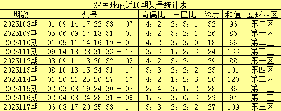 双色球第2025117期开出奖号:06 08 17 20 25 33 + 10。其中红球三区比为2:2:2,和值为109,奇偶比为3:3,跨度为27,蓝球出现在第三区。