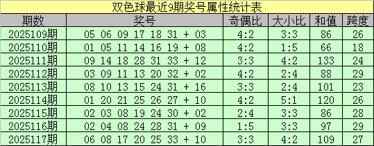 双色球上期第2025117期奖号为06 08 17 20 25 33 + 10,红球号码奇偶比为3:3,大小比为4:2,和值为109,跨度:27。