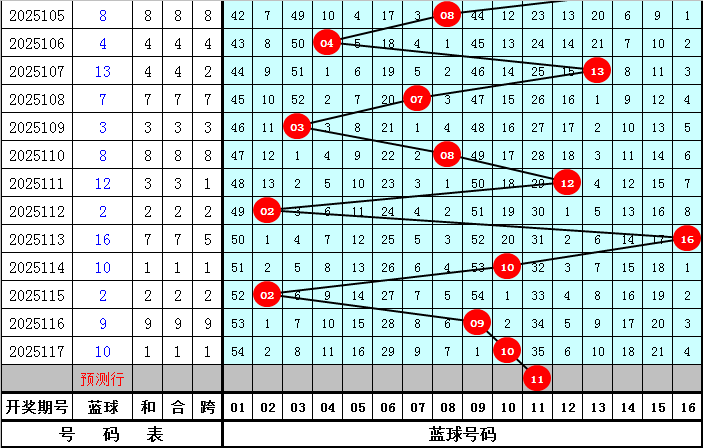 前9期开出7个蓝球号码,蓝球以冷码为主,热码蓝球开出相对较少,还没有出现的蓝球为:01、04、05、06、07、11、13、14、15,共9个,本期防蓝球为冷码,遗漏值较大,参考蓝球号码11。