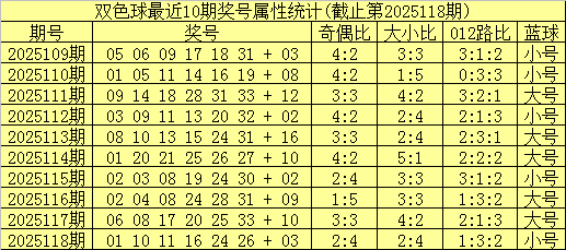 双色球第2025118期开奖号码:01 10 11 16 24 26 + 03。红球大小比为2:4,奇偶比为2:4,012路比为1:3:2,蓝球开出小 号。