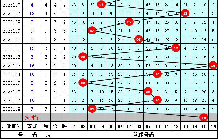 蓝球分析:上期蓝球为小 号03,最近10期大小蓝球号码分别出现5次,走势相当,本期蓝球关注大号,推荐号码15。