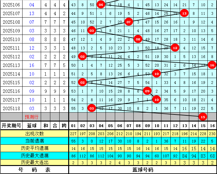 蓝球:上期蓝球号码为03,开出小 号、奇数,蓝球最近7期大小比为4:3,本期注意大号蓝球出现,蓝球关注15。