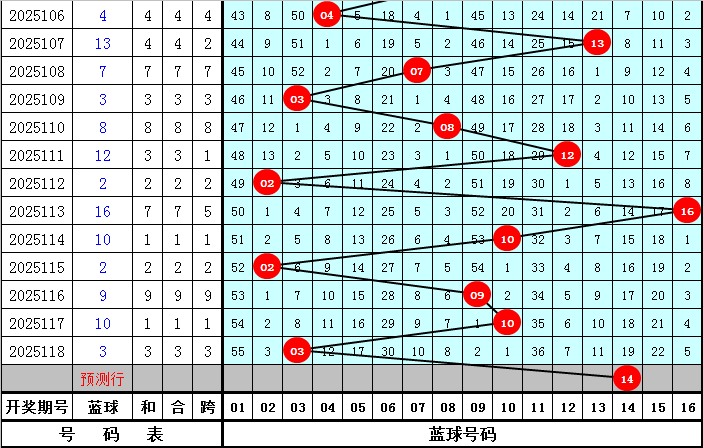 蓝球分析:去年第119期蓝球奖号为14,开出2路蓝球,今年同期注意2路蓝球继续开出,参考蓝球14。