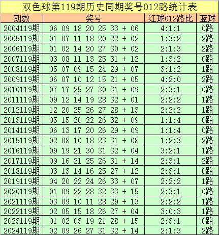 福彩双色球第2025119期历史同期王守礼012路奖号遗漏分析: