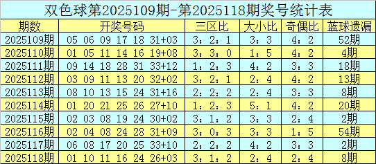 红球三区比推荐:最近3期红球三区比分别开出3:0:3、2:2:2、3:1:2,3期红球三区比总比例为8:3:7,本期重防红二区号码走势热出,关注三区比1:3:2。